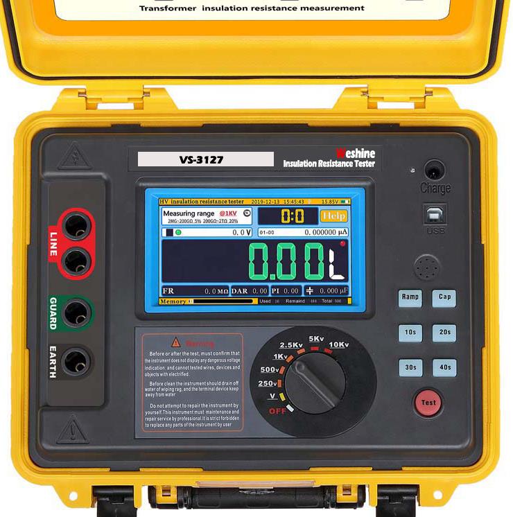 Weshine® VS-3127 працює від батарейокІндекс поляризації трансформатораз цифровим і аналоговим дуговим дисплеєм, розроблений для тестування опору ізоляції високої напруги при обслуговуванні кабелів, обертових установок, трансформаторів, розподільних пристроїв і промислових застосувань.